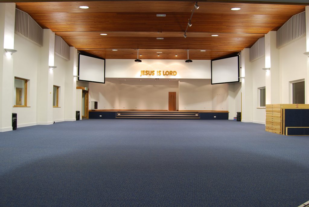 This is our main room for Sunday worship and can seat up to 220 people; comfortable upholstered chairs allow a variety of layouts.